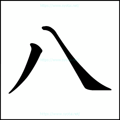 八の行書体|楷書体|明朝体|篆書体|ゴシック体 2画の漢字 2020.09.242020.11.18 漢字の「八」の行書体、楷書体、篆書体、明朝体、ゴシック体、メイリオ、教科書体などの書体まとめ。 スポンサーリンク 目次 八の構成八の行書体八の楷書体八の明朝体八のゴシック体八の丸ゴシック体八のメイリオ八の教科書体八の篆書体・篆刻体 八の構成 文字 八 部首 八 画数 2 学年 1 読み方 ハチやや-つやっ-つよう 八の行書体 八の楷書体 八の明朝体 八のゴシック体 八の丸ゴシック体 八のメイリオ 八の教科書体 八の篆書体・篆刻体